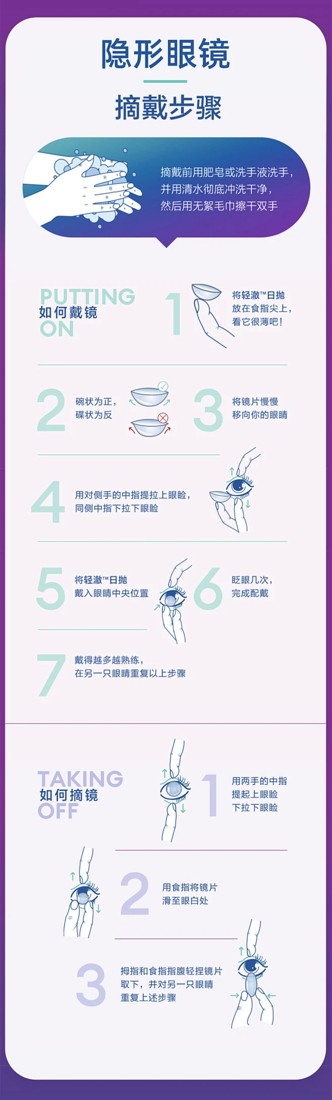 食指托住镜片(正面朝上),轻贴眼球中央,勿眨眼1411。